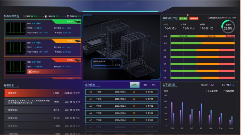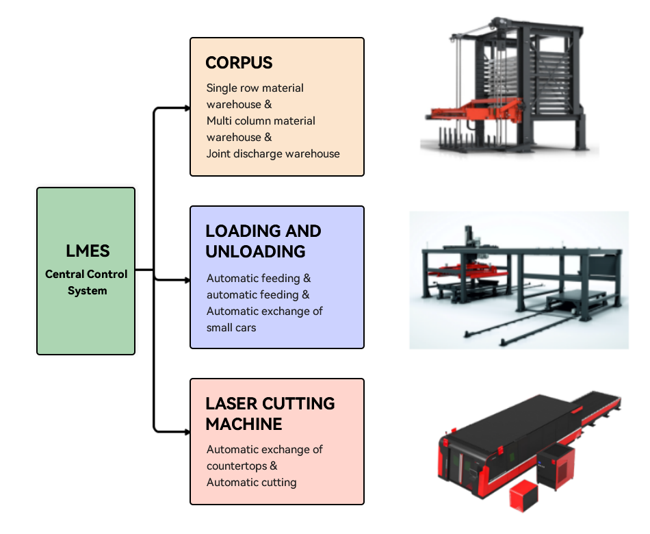 Sistema de automação de corte a laser de chapa metálica:Abrangendo armazenagem de matérias-primas, matérias-primas retiradas do armazém, alimentação automática a laser, marcação de galvanômetros de avião, marcação de equipamentos, corte a laser, triagem e descarregamento automáticos a laser, triagem manual, relatórios automáticos, trabalhos em andamento e transporte para outros processos subsequentes.