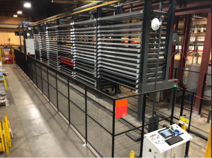 O armazenamento automático de materiais consiste em torre de material, empilhador de trilhos, entrada e saída e software especial de gerenciamento, que é conectado à unidade de corte a laser e à unidade de automação de curvatura.