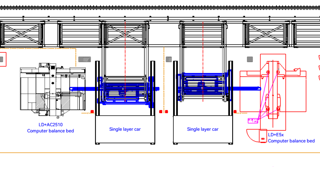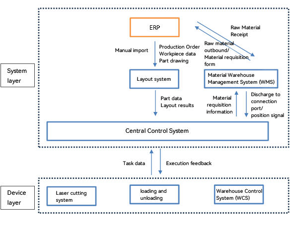 De acordo com o plano de produção, estações de trabalho de armazenamento de materiais com múltiplas colunas são usadas para armazenar e gerenciar centralmente as placas e enviá-las automaticamente para cada unidade de corte a laser. O fluxo do processo é o seguinte: armazenagem de matérias-primas — descarga de armazém de materiais — alimentação automática — corte a laser — descarga automática — triagem manual