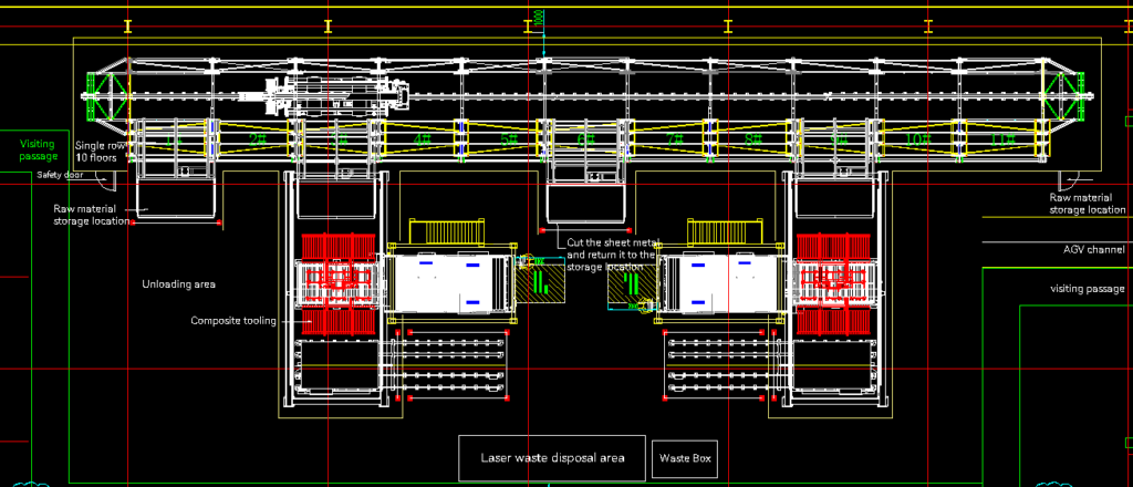 O sistema flexível de processamento automatizado de chapa metálica descrito neste plano inclui um novo conjunto de unidades tridimensionais de armazém em fileira única e dois conjuntos de máquinas de corte a laser, sistemas automáticos de carregamento e descarga um a um, que realizam transferência automática, alimentação automática, corte automático e descarga automática de matérias-primas, além de realizar produção automatizada (referindo-se a produtos adequados para processamento automatizado em linhas). Cada unidade de processamento também pode operar de forma independente no “modo offline”, e cada uma pode ser conectada à unidade de armazém para realizar o processamento em ciclo lote de diferentes peças de trabalho.