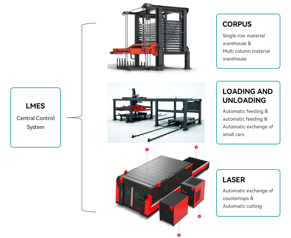 O sistema automatizado flexível de processamento e armazenamento de materiais de chapa metálica está centrado em um novo conjunto de unidades tridimensionais de armazenamento de materiais tridimensionais, de uma fileira única, e uma unidade de processamento automatizada independente e um sistema de processamento para entrar e sair do carrinho de armazenamento estão dispostos ao lado do armazenamento tridimensional de materiais. Possui funções de carregamento e descarga automática, armazenamento e transferência automática de matérias-primas.